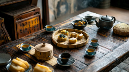 An artistic shot of a rustic wooden table with along with tea cups and bamboo steamers, creating an inviting and cozy dining scene.