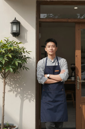Portrait of an Asian male waiter standing at the front door of a restaurant