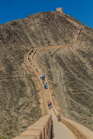 JIAYUGUAN, CHINA - AUGUST 22, 2018:Tourists visit Overhanging Great Wall near Jiayuguan, Gansu Province, China
