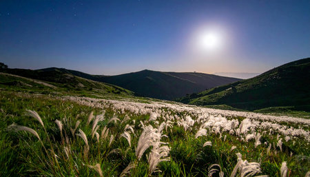 Mountain meadow at the night with full moon and stars in the sky