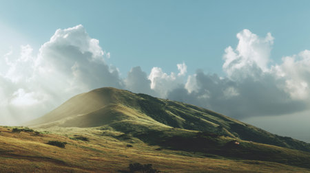 A peaceful scene featuring rolling hills bathed in gentle sunlight and framed by a cloudy sky, capturing the tranquility of nature's serene beauty.