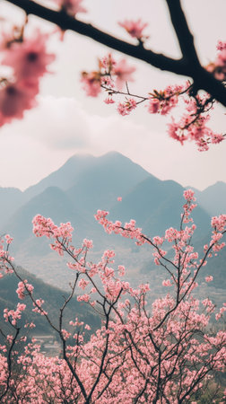 Cherry blossoms with mountain backdrop, scenic landscape. Nature and serenity concept