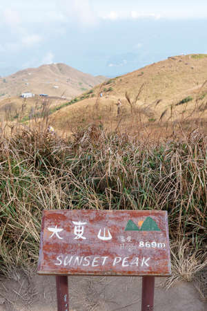 Sign of Sunset Peak on Lantau Island, Hong kong. The Chinese character is the Chinese name of Sunset Peak