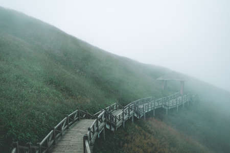 Wooden plank path between meadow covered in fog on top of Wugong Mountain (Wugongshan) in Jiangxi, China