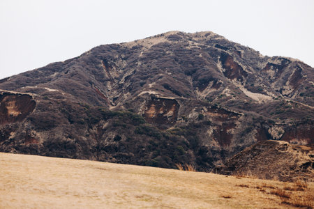 Scenic Landscape of Mount Aso with Vast Grassland under Blue Sky in Kumamoto, Japan