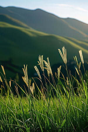 Grass flower in the morning light with mountains background, Thailand.