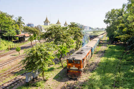 YANGON, MYANMAR - NOVEMBER 3, 2013 - A Circular Railway Train leaves Yangon Central Railway Station in Yangon Rangoon circa November 2013 Yangon Circular Railway is the local commuter rail network that serves the Yangon metropolitan area