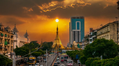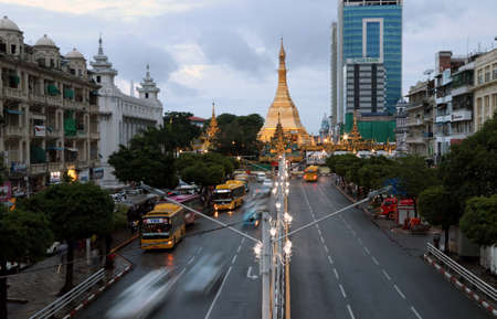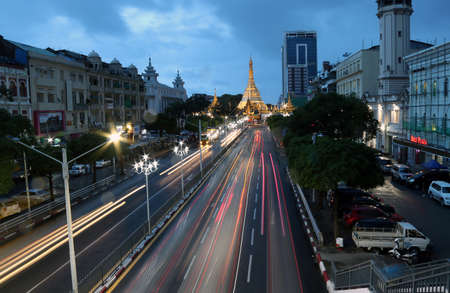 Streets of downtown Yangon Myanmar road to Sule Gold Pagoda sunset with traffic jam and modern city center. Buddhist sacred worship transport long exposure car light on street famous holy night town