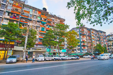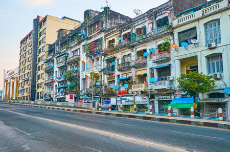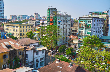 YANGON, MYANMAR - FEBRUARY 15, 2018: The residential buildings along Botataung Pagoda road of Pazundaung Township, on February 15 in Yangon.