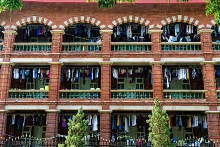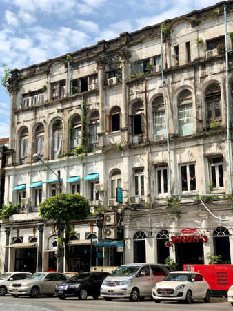 Yangon, Myanmar - Jan 14, 2015. Old residential building in Yangon, Myanmar. Century-old buildings with magnificent architecture are main tourist attraction in downtown Yangon.