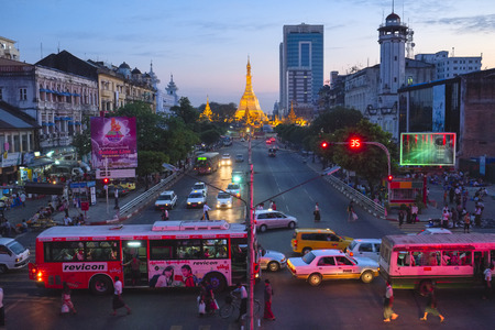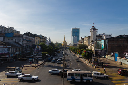 Yangon, Myanmar - March 24,2011: Traffic in downtown Yangon in Yangon, Myanmar or Burma. In the middle of a roundabout, stands the Sule Pagoda, a religious and historic site