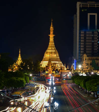 Yangon, Myanmar June 6, 2018: Twilight time and speed of light at golden octagon of Sula pagoda located in the heart of downtown Yangon, making it more than 2,600 years old, with building and many cars on the junction of Sule Pagoda road.