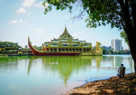 Yangon, Myanmar - Oct 16, 2015. View of Karaweik Hall, a palace on the eastern shore of Kandawgyi Lake, Yangon, Myanmar. Yangon is a former capital of Myanmar.