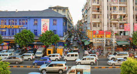 Yangon, Myanmar - Feb 13, 2017. People and vehicles on street in Yangon, Myanmar. Yangon is the country main centre for trade, industry, and real estate.