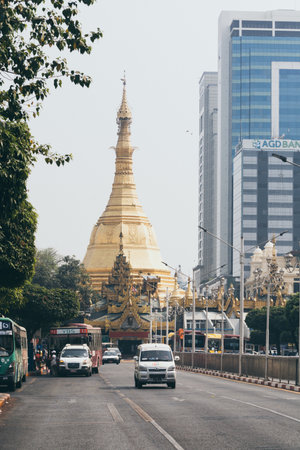 Yangon, Myanmar June 6, 2018: Golden octagon of Sula pagoda located in the heart of downtown Yangon, making it more than 2,600 years old, with building and many movement cars on the junction of Sule Pagoda road.