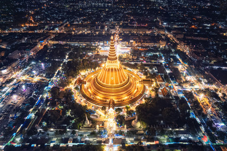 Aerial view of Majestic golden pagoda of Phra Pathom Chedi glowing among the festival lights around the roundabout road in downtown at Nakhon Pathom, Thailand