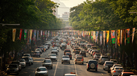 A snapshot of a street filled with bumper-to-bumper traffic during a city event, with banners and decorations hinting at the festivities overshadowed by congestion