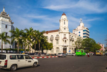 Yangon, Myanmar - December 19, 2019: General view of traffic on Strand Road, with the Southern Yangon District Court building on the corner with Pansodan street, in Downtown Yangon.