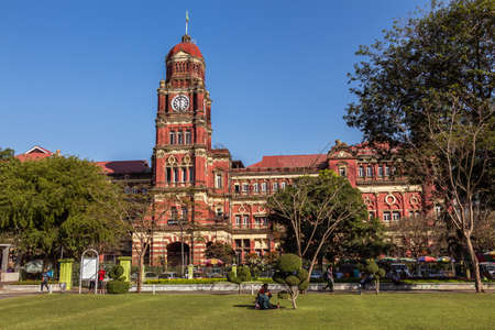 Yangon, Myanmar - December 18th 2017: The red brick Yangon High Court colonial building, at Maha Bandula Garden, Yangon, Myanmar