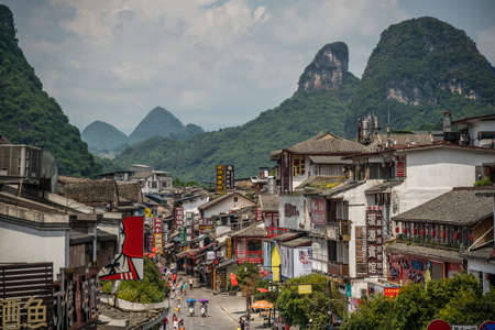 Yangshuo, China - August 2019 : Old town street lined with souvenir shops in the centre of town, Guangxi Province