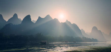 Misty sunrise behind strange mountain in Lijiang River Guilin Guangxi China