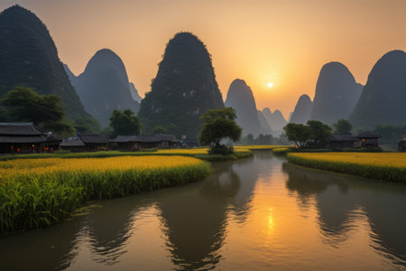 Sunset scene in Guilin, China, with stunning rock and river