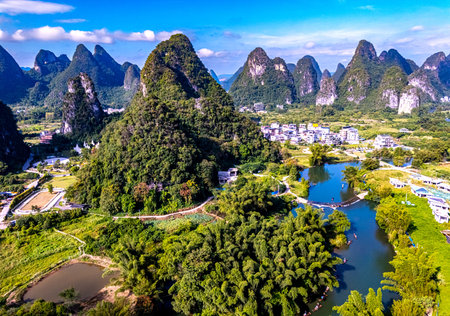 Yangshuo county and Li river in Guilin, China aerial view