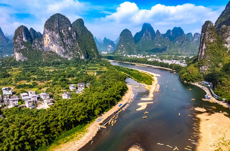 Panoramic view of Li River and Karst mountains in Yangshuo, China