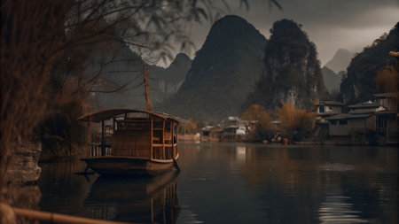 A tranquil river flows through a stunning landscape of misty mountains. A solitary boat drifts peacefully, surrounded by lush greenery and scenic beauty.