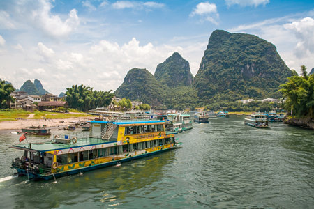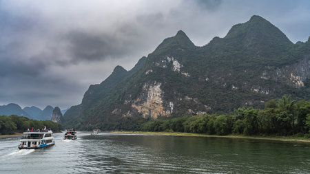 Tourist sail ships along the picturesque riverbed. Lush green vegetation on the shores. Mountains against the sky and clouds. Ripples on the surface of the water. China. Lee River.