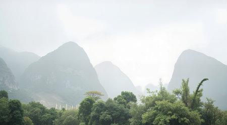 Mountains and trees in the mist, Guilin, China