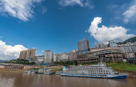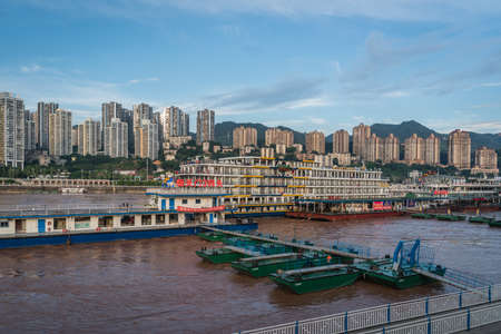 Chongqing, China - August 2019 : Luxury passengers cruise ships ready to depart from Chongqing wharf on a trip through the Three gorges on the Yangtze river in summer