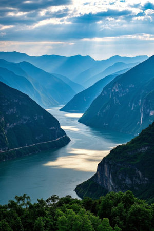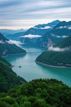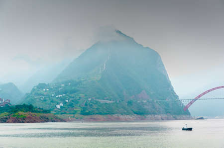 The Three Gorges of the Yangtze River are quiet and charming, with majestic peaks, clear river water and shrouded clouds. Trail on the mountain wall.