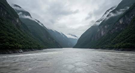 Discover a breathtaking view of a serene mountain river flowing through a lush green valley, surrounded by misty peaks and vibrant natural beauty.