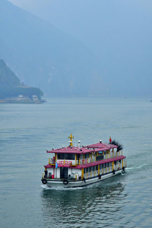 Yangtze River, China - August 2019 : Large luxury passenger boat docked on the Yangtze river shore in Badong, the starting point for small boat trip cruises along the Shennong stream, Hubei Province