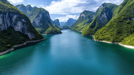 A panoramic view of a Chinese canyon with steep cliffs and a winding river. No people, copy space.