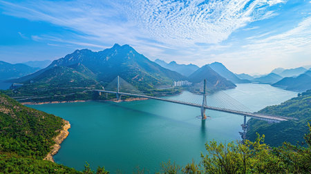 A stunning landscape featuring a modern bridge spanning calm waters, surrounded by lush mountains and a vibrant sky, perfect for nature enthusiasts.