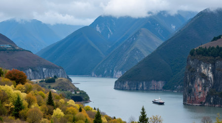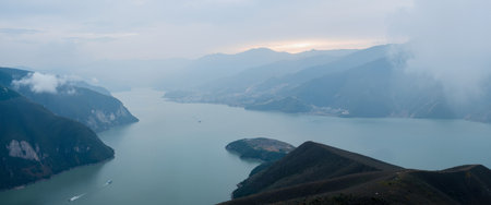 foggy scenery along the Yangtze River in China including some ships and mountains