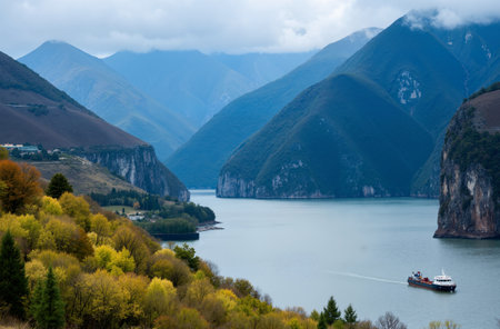 Travel by boat on the Yangtze River with a view of the mountains and the town