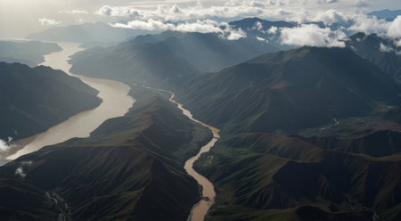 Generative AI : Aerial view of Aoos river estuary with mountain in background Tepelena Gjirokaster Albania