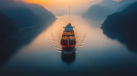 Generative AI : Hong Kong China 21 October 2022 Aerial view of a cargo ship sailing the Hong Kong bay with low clouds China