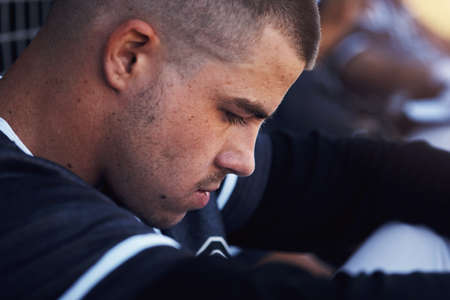 Lifes greatest lessons are learned in a baseball league. Shot of a young man looking unhappy at a baseball game.