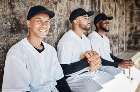 Baseball player portrait, bench or sports man on field at competition, training match on a stadium pitch. Softball exercise, fitness workout or happy players playing a game in team dugout in summer