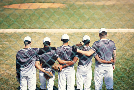 They dont call it team mate for nothing. Rearview shot of a group of young men standing together in solidarity at a baseball game.