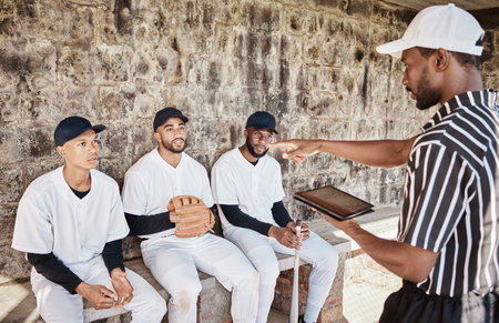 Team, tablet or baseball coach with a strategy, planning or training for progress with a game field formation. Leadership, mission or manager with sports men or athlete group for fitness or goals