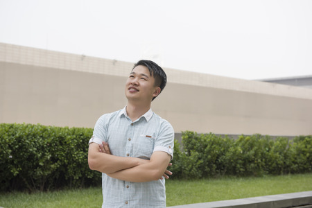 portrait of asian freelance businessman in modern office, man with arms crossed looking seriously at camera