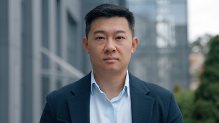 Closeup portrait in city calm serious Asian business man middle-aged businessman headshot confident Japanese entrepreneur Chinese employer Korean male professional posing in downtown looking at camera