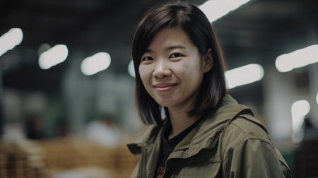 A smiling Chinese female factory worker standing in warehouse. Generative AI AIG19.