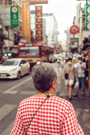 BANGKOK, THAILAND - November 5, 2021: Elder Asian woman walking on Yaowarat Road, Bangkok's Chinatown. Yaowarat Road is a famous street food attraction in Bangkok.