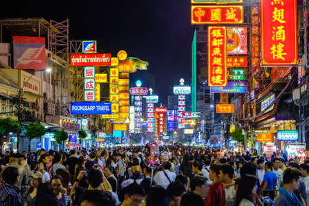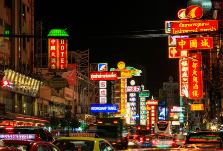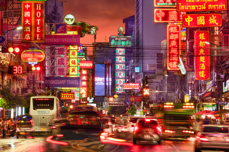 BANGKOK - MARCH 21: Busy Yaowarat Road in the evening on March 21, 2014 in Bangkok. Yaowarat Road is a main street in Bangkok's Chinatown, it was opened in 1891 in the reign of King Rama V.